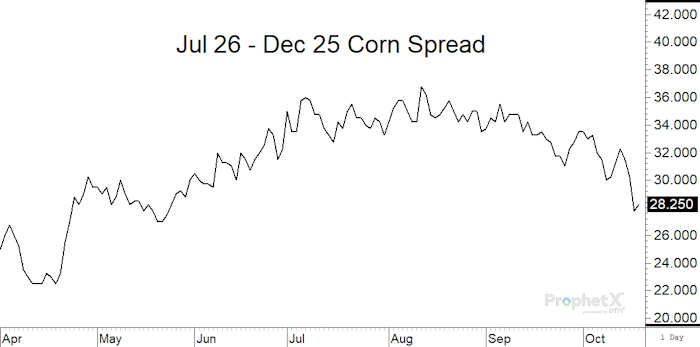 About this chart: This is the chart of the spread between December 2025 corn futures and July 2026 corn futures. This is often called the carrying charge spread. This spread bottomed out at 18 cents in late February. Then the spread widened out as crop production estimates increased, with the spread getting out to 36 cents in mid-August (just as the corn futures market bottomed). The spread closed at 28¢ on Friday. The next target on my chart is the April low at 23¢. [Chart source: DTN/ProphetX]