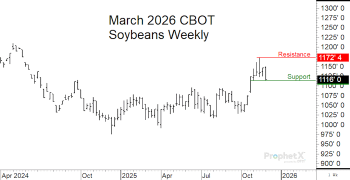 About this chart: This is the weekly chart of CBOT March soybeans. You can see the low ($10.17) in the first week of August 2025, and the rally to the high ($10.94), before pulling back to the harvest low ($10.28) in early October. The soybean market then rallied $1.44 per bushel to the November high ($11.72). In the last five weeks, March futures have had lows of $11.13, $11.27, $11.23, $11.25 and the low this week at $11.15.