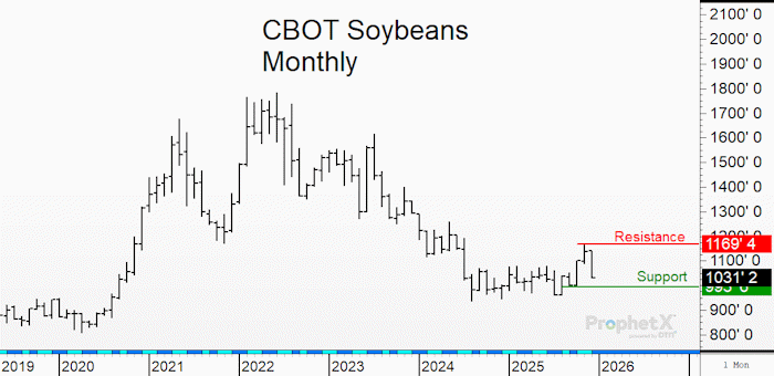 About this chart: This is the monthly continuation chart of CBOT soybean futures. You can see the major high ($17.80) in June 2022, and the trend lower to the major low ($9.36) in August 2024. The market stayed in a $1.50 trading range for the next year. In October, prices rallied above $10.70 resistance with a high posted at $11.69 in early November 2025. Prices were hit hard in November. Now long-term support is at the $10.00 benchmark.