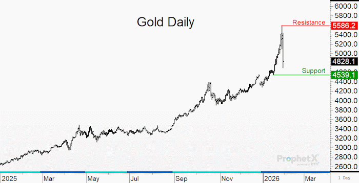 About this chart: This is the daily continuation chart of gold futures. You can see the bullish trend (which started in January 2025) may have just reached a major high this week at $5,586. The extreme volatility that was seen on Thursday and Friday amounted to a range of $886 or nearly a 16%. This may be a once-in-a-lifetime move we just witnessed.