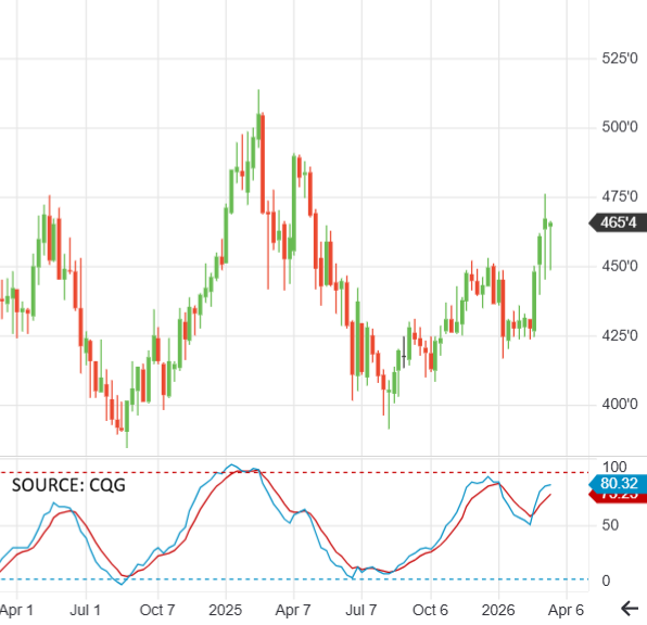 ABOUT THIS CHART: This is the weekly continuation chart of corn futures. You can see the 50-cent rally over the past month has put the front-month contract at levels similar to late April 2025 and May 2024. If the bulls are able to keep pushing higher, then the next upside targets would be the April 2025 high ($4.91) and then the February 2025 high ($5.14). Momentum indicators (below the price chart) still favor the bulls, suggesting we could see the rally last a little longer. The month-end acreage report and war headlines are the two most important items to be watched in the short term.